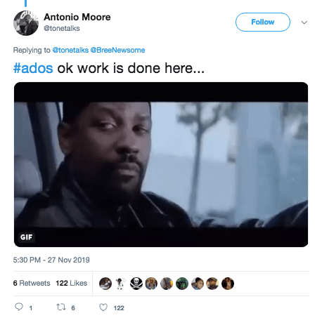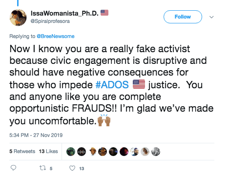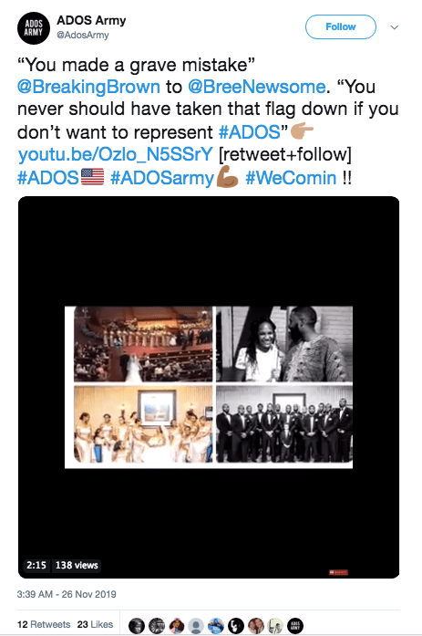 For several days, ADOS group members launched an online attack on activist Bree Newsome Bass. After announcing that she would not like to be referred to as, “ADOS” a flood of Twitter accounts using the hashtag ADOS swarmed her account. The ADOS movement accounts resorted to name calling, pulling up family photos, and a co-founder of the group, Yvette Carnell, made a 2 hour video taunting Bass (including photos of Bass’ wedding) for refusing to join their movement.