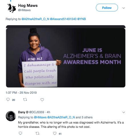 Actress Yvette Nicole Brown has been very vocal and outspoken about the problematic rhetoric of the ADOS movement. As a result, she has been the target of several ADOS swarms, where hundreds of Twitter accounts harass and attack her online. Recently, an ADOS group member altered a photo of Yvette Nicole Brown’s advocacy work with the American Alzheimer’s Association.