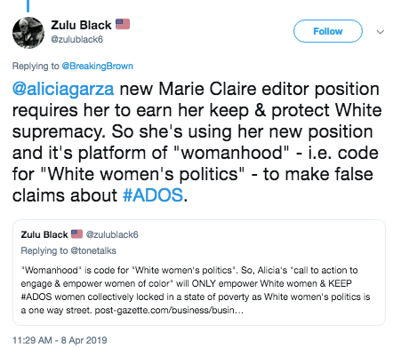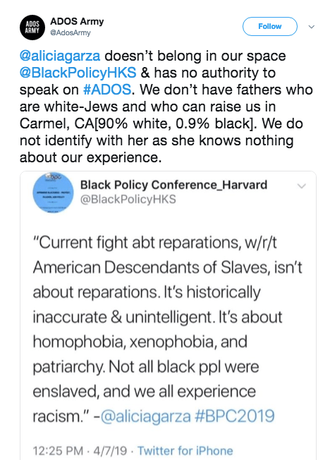 ADOS group members and founders attack co-founder of Black Lives Matter, Alicia Garza after she discussed reparations in a NY Times op-ed titled, “Dear Candidates: Here is What Black People Want” and after becoming the an editor at Marie Claire.